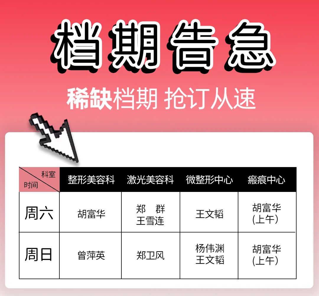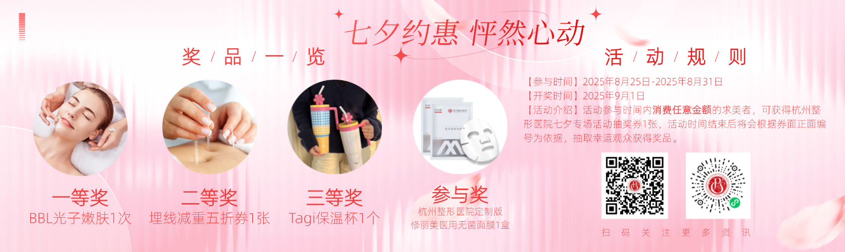 為 / 愛 / 放 / 價(jià) 當(dāng)星河傾瀉愛意,當(dāng)時(shí)光遇見年輕 真正的浪漫,是勇敢去愛,也是坦然被愛 這個(gè)七夕,讓美麗與愛意共同綻放 以最自信的姿態(tài),迎接屬于您的怦然心動(dòng) 活動(dòng)時(shí)間: 活動(dòng)期間,所有到院顧客只需在精心布置的七夕主題打卡區(qū)拍照留念,并將照片分享至社交平臺(tái),即可獲得一份精心準(zhǔn)備的七夕限定禮品(限量100份)。 讓每一次分享都成為美麗的見證。 活動(dòng)期間消費(fèi)顧客不論金額大小,均可得抽獎(jiǎng)券一張,每張抽獎(jiǎng)券都有特定編號(hào),活動(dòng)結(jié)束后(9月1日)開獎(jiǎng),隨機(jī)抽取一二三等獎(jiǎng)、參與獎(jiǎng),獎(jiǎng)品分別為: 一等獎(jiǎng):BBL光子嫩膚 二等獎(jiǎng):埋線減重五折券 三等獎(jiǎng):tagi水杯 參與獎(jiǎng):杭州整形醫(yī)院定制版修麗美無菌醫(yī)用面膜 【七夕特惠】 美麗投資超值套餐 胡富華 副主任醫(yī)師 擅長項(xiàng)目:疤痕修復(fù)整形、脂肪塑形、饅化臉修復(fù)、腹壁成形、口唇整形、眼鼻整形、除腋臭,富貴包等。 中國整形美容協(xié)會(huì)瘢痕醫(yī)學(xué)分會(huì)委員 中國整形美容協(xié)會(huì)腫瘤修復(fù)分會(huì)委員 中華醫(yī)學(xué)會(huì)整形外科學(xué)分會(huì)瘢痕學(xué)組委員 中華醫(yī)學(xué)會(huì)整形外科學(xué)分會(huì)創(chuàng)面修復(fù)學(xué)組委員 中國醫(yī)師協(xié)會(huì)顯微外科醫(yī)師分會(huì)網(wǎng)絡(luò)培訓(xùn)專委會(huì)委 中國康復(fù)醫(yī)學(xué)會(huì)修復(fù)重建外科委員會(huì)繼教委員會(huì)委員 中國老年保健協(xié)會(huì)基層皮膚病與醫(yī)學(xué)美容醫(yī)聯(lián)體分會(huì) 基層常務(wù)委員 浙江省醫(yī)學(xué)會(huì)整形外科學(xué)分會(huì)委員 浙江省整形美容行業(yè)協(xié)會(huì)醫(yī)學(xué)美容微創(chuàng)分會(huì)副會(huì)長 浙江省整形美容行業(yè)協(xié)會(huì)美容外科分會(huì)常務(wù)理事 浙江省整形美容協(xié)會(huì)疤痕整形分會(huì)理事 浙江省針灸學(xué)會(huì)醫(yī)學(xué)美容專業(yè)委員會(huì)委員 杭州市醫(yī)學(xué)會(huì)小兒外科分會(huì)委員 杭州市醫(yī)學(xué)會(huì)腫瘤學(xué)分會(huì)委員 專家簡介 鄭群 副主任醫(yī)師 擅長項(xiàng)目:各種面部除皺嫩膚、緊致提升,面部皮膚年輕化,皮膚色素斑如太田痣、咖啡斑、先天性雀斑、皮膚老化斑、色素痣,冷凍減脂,私密整形的激光治療等。 中國整形協(xié)會(huì)微創(chuàng)與皮膚整形美容分會(huì)常務(wù)委員 杭州市整形美容行業(yè)協(xié)會(huì)(美容皮膚專業(yè))專家委員 浙江省整形美容行業(yè)協(xié)會(huì)激光美容分會(huì)委員 浙江省整形美容行業(yè)協(xié)會(huì)醫(yī)學(xué)美容外科分會(huì)委員 浙江省康復(fù)醫(yī)學(xué)會(huì)修復(fù)重建委員會(huì)委員 專家簡介 楊偉淵 副主任醫(yī)師 擅長項(xiàng)目:微創(chuàng)注射美容(輪廓固定/面部下垂組織復(fù)位/動(dòng)靜皺紋干預(yù)治療/玻尿酸、膠原蛋白注射)、綜合美學(xué)設(shè)計(jì)(結(jié)合情緒美學(xué)+光影折疊美學(xué)+“TOo”美學(xué))、眼周/口周/頸部年輕化。 中國整形美容協(xié)會(huì)微創(chuàng)與皮膚美容整形分會(huì)常務(wù)委員 中國整形美容協(xié)會(huì)醫(yī)美與藝術(shù)分會(huì)線雕美容藝術(shù)專業(yè)委員 中國非公立醫(yī)療機(jī)構(gòu)協(xié)會(huì)整形與美容專業(yè)委員會(huì)青年委員會(huì)委員 浙江省整形美容行業(yè)協(xié)會(huì)美容外科分會(huì)委員 浙江省整形美容行業(yè)協(xié)會(huì)抗衰老分會(huì)委員 浙江省整形美容行業(yè)協(xié)會(huì)面部年輕化與形體管理分會(huì)委員 浙江省整形美容行業(yè)協(xié)會(huì)疤痕分會(huì)委員 浙江省醫(yī)學(xué)會(huì)醫(yī)學(xué)美學(xué)與美容學(xué)分會(huì)青年委員 喬雅登+保妥適指定注射醫(yī)師 高德美(瑞藍(lán)+吉適)培訓(xùn)講師 艾維嵐童顏認(rèn)證醫(yī)師 雙美、弗縵膠原蛋白指定注射醫(yī)師 嗨體指定注射醫(yī)師 伊婉指定注射醫(yī)師 第八屆西湖·論劍學(xué)術(shù)大會(huì)微整注射“最佳效果獎(jiǎng)”